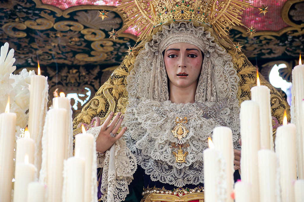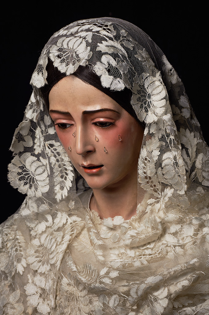 Se trata de una imagen de candelero, teniendo talladas la cabeza y la manos. El candelero, compuesto por ocho listones, le nace de la cadera, alcanzando la Virgen una altura de 174 centímetros. La cabeza se encuentra frontal y ligeramente inclinada hacia abajo, con cejas arqueadas y un leve fruncido en el entrecejo. Los ojos son de cristal, en color marrón, con pestañas postizas en el párpado superior y pintadas en el inferior. De ellos bajan cinco lágrimas, también de cristal, que recorren las mejillas situándose dos en el lado derecho y tres en el izquierdo. La mirada es baja y centrada, favoreciendo el contacto con el devoto.