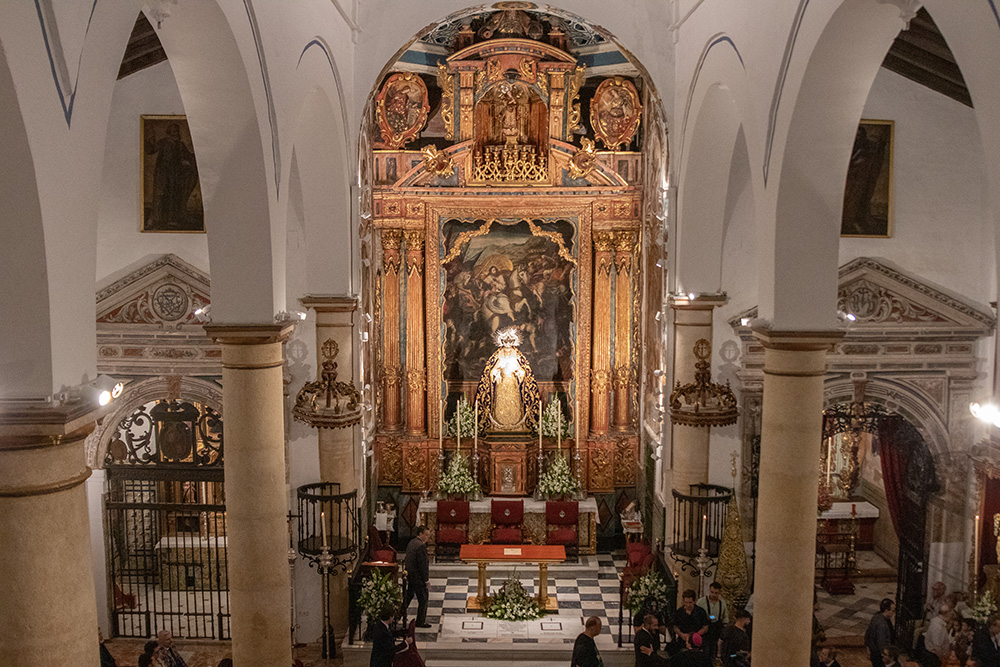 El retablo mayor fue realizado por el escultor Andrés de Ocampo para la capilla funeraria de Don Gonzalo Argote de Molina. La obra se paralizó por falta de liquidez del promotor y por su muerte, siendo reiniciada por su hermana, Doña Francisca de Mexía, quien encargó a Ocampo que no siguiera la traza primitiva, sino la nueva proyectada junto a Bermudo Resta, datándose en 1599.