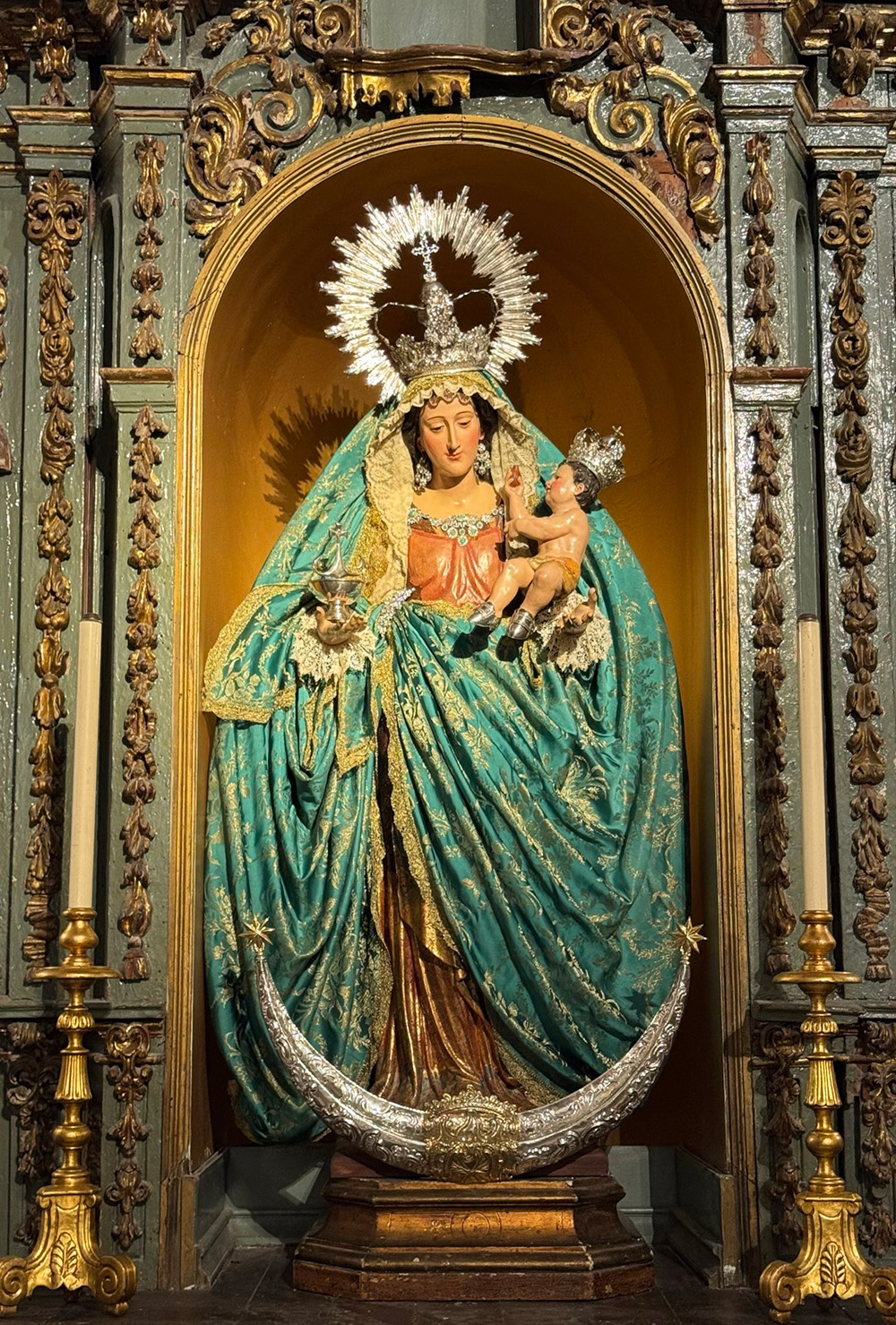 En 1789 se amplió en su parte inferior el cuadro de Mateo Pérez de Alesio y aumentó la decoración del retablo, alterando su estado original. El cuerpo del retablo presenta cuatro columnas corintias y alberga hoy la imagen de María Santísima del Rocío Coronada; tras ella se sitúa la pintura de Santiago el Mayor, obra de Mateo Pérez de Alesio (siglo XVI). En el ático aparecen representaciones del Espíritu Santo, coronadas por el busto del Padre Eterno. Posteriores a la planimetría original son los dos tondos afrontados que flanquean el ático, representando la Anunciación, igualmente agregados en 1600.